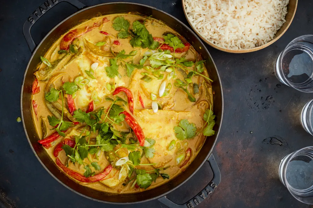 Coconut fish curry is a creamy, spiced curry made with tender fish simmered in coconut milk and aromatic seasonings.